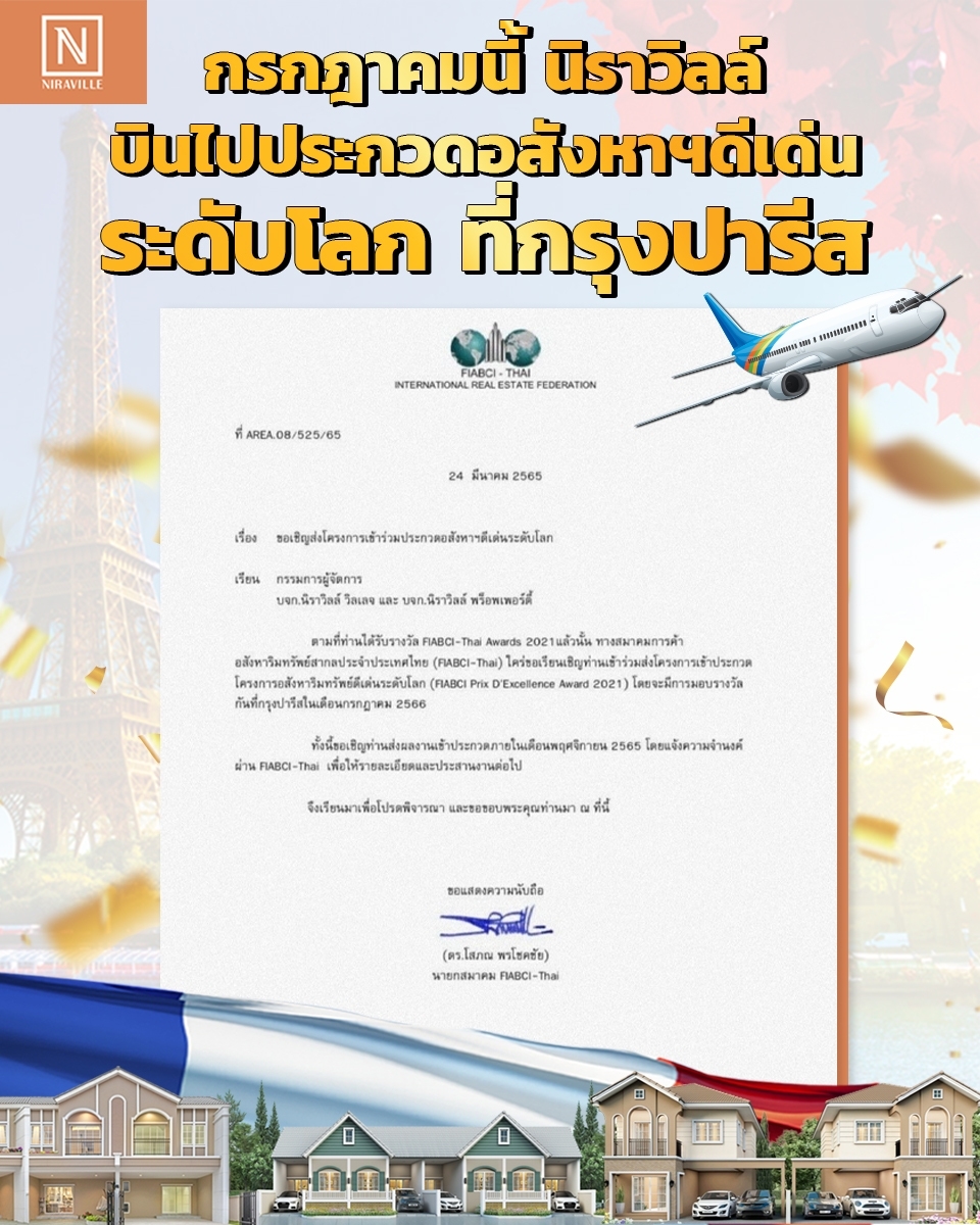 ขอแสดงความยินดีกับนิราวิลล์สำหรับรางวัลอสังหาฯดีเด่นระดับนานาชาติประจำปี 2021จาก FIABCI-Thai สมาคมการค้าอสังหาริมทรัพย์สากลที่ได้เชิญ คณะกรรมการตัดสินซึ่งเป็นบุคคลชั้นนำในวงการอสังหาริมทรัพย์ทั้งในและต่างประเทศเป็นกรรมการร่วมตัดสิน FIABCI THAI AWARDS 2021 ขอแสดงความยินดีกับนิราวิลล์สำหรับรางวัลอสังหาฯดีเด่นระดับนานาชาติประจำปี
